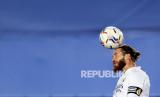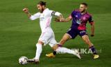 Bek Real Madrid Sergio Ramos (kiri) beraksi melawan striker Valladolid Sean Weissman (kanan) pada pertandingan LaLiga Santander Spanyol antara Real Madrid dan Real Valladolid di stadion Alfredo Di Stefano di Madrid, Spanyol (30/9/2020).