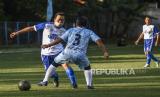 Sekda Kota Bandung Ema Sumarna (kiri) berusaha melewati pemain dari tim DPRD Kota Bandung saat pertandingan sepak bola antar pimpinan di SOR Sepak Bola Lodaya, Jalan Lodaya, Kota Bandung, Kamis (1/10). Pertandingan tersebut bertujuan untuk mempererat silaturahmi, jaringan dan kekompakan antar instansi. Foto: Abdan Syakura/Republika (FOTO : ABDAN SYAKURA/REPUBLIKA)