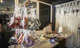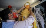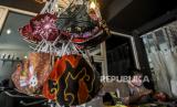 Pekerja memasangkan masker berbahan kain batik ke manekin di Butik Elemwe, Rawamangun, Jakarta, Jumat (2/10). Dalam sehari industri rumahan tersebut mampu membuat 300 buah masker kain batik dengan harga jual Rp 28.000 hingga Rp 35.000 per buah. Republika/Putra M. Akbar (FOTO : Republika/Putra M. Akbar)