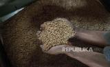 Pekerja menunjukkan gabah giling di Desa Pasireurih, Lebak, Banten, Jumat (2/10/2020). Menurut data BPS pada September 2020, harga gabah kering panen (GKP) di tingkat petani naik sebesar 1,53 persen menjadi Rp4.891 per kilogram, sementara di tingkat penggilingan GKP naik sebesar 1,85 menjadi Rp4.996 per kilogram dibandingkan harga gabah dengan kualitas yang sama pada bulan sebelumnya. (FOTO : MUHAMMAD BAGUS KHOIRUNAS/ANTARA FOTO)