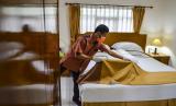 Pekerja membersihkan ruang dan kamar di Hotel The Priangan, Kabupaten Ciamis, Jawa Barat, Jumat (2/10/2020). Badan Pusat Statistik (BPS) mencatat tingkat Penghunian Kamar (TPK) hotel klasifikasi bintang di Indonesia pada Agustus 2020 mencapai 32,93 persen atau turun 21,21 poin dibandingkan dengan TPK tahun lalu sebesar 54,14 persen, namun jika dibandingkan dengan TPK Juli 2020, angka tersebut mengalami kenaikan sebesar 4,86 poin. (FOTO : ANTARA/Adeng Bustomi)