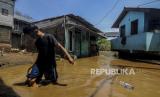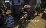 Warga menggendong anaknya saat terjadi banjir di kawasan Kebon Pala, Jakarta, Senin (5/10). Hujan deras di wilayah Jabodetabek pada Ahad (4/10) malam, membuat sebanyak 92 RT terendam banjir dengan rata-rata ketinggian mencapai 10-150 sentimeter. Republika/Putra M. Akbar (FOTO : Republika/Putra M. Akbar)