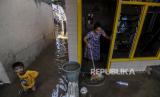 Warga membersihkan rumahnya saat terjadi banjir di kawasan Kebon Pala, Jakarta, Senin (5/10). Hujan deras di wilayah Jabodetabek pada Ahad (4/10) malam, membuat sebanyak 92 RT terendam banjir dengan rata-rata ketinggian mencapai 10-150 sentimeter. Republika/Putra M. Akbar (FOTO : Republika/Putra M. Akbar)
