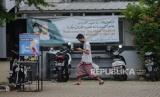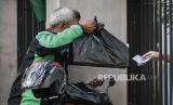 Pengendara ojek daring mengantarkan barang di area luar pagar kampus di Institut Perguruan Tinggi Ilmu Alquran (PTIQ) di kawasan Cilandak, Jakarta Selatan, Senin (5/10). Sekitar 200 mahasiswa PTIQ terkonfirmasi positif Covid-19 hasil dari tracing melalui tes usap hingga saat ini masih dilakukan proses evakuasi sejumlah pasien menuju Wisma Atlet dan Tower Pademangan. Republika/Thoudy Badai (FOTO : Republika/Thoudy Badai)