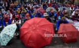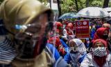 Sejumlah buruh dari berbagai serikat dan organisasi berunjuk rasa di depan Balai Kota Bandung, Jalan Wastukencana, Kota Bandung, Selasa (6/10). Dalam unjuk rasa tersebut mereka menolak pengesahan UU Cipta Kerja dan mengancam akan melakukan mogok kerja pada 6-8 Oktober 2020. Foto: Abdan Syakura/Republika (FOTO : ABDAN SYAKURA/REPUBLIKA)