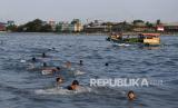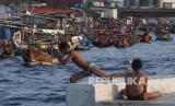 Nelayan mengemudikan kapal melintasi anak yang berenang di Cilincing, Jakarta, Rabu (7/10/2020). Presiden menginstruksikan kepada intansi terkait untuk mendorong pemberian stimulus kepada nelayan dan petani dalam rangka meningkatkan perekonomian nasional. (FOTO : Antara/Wahyu Putro A)