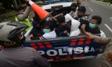 Petugas kepolisian mengamankan sejumlah pelajar yang diduga hendak mengikuti aksi di Kawasan Senayan, Jakarta, Kamis (8/10). Puluhan pelajar tersebut diduga terhasut ajakan aksi demo menolak UU Cipta kerja.Prayogi/Republika (FOTO : Prayogi/Republika)