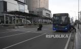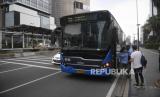 REPUBLIKA.CO.ID, JAKARTA -- Penumpang turun dari bus Transjakarta di samping halte Bundaran HI yang hangus terbakar, di Jakarta, Sabtu (10/10/2020).