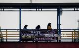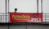 Sebuah spanduk penolakan anarkisme terpampang di JPO sekitar jalan Salemba, Jakarta, Ahad (11/10). Selain mengganggu keamanan dan ketenteraman, kondisi kekacauan atau demo yang berujung anarkis membuat roda perekonomian warga terhambat.Prayogi/Republika (FOTO : Prayogi/Republika)