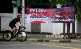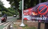 Pengendara motor melintas di dekat spanduk imbauan tolak anarkisme di Jakarta, Ahad (11/10/2020). Spanduk imbauan untuk tidak melakukan aksi anarkisme yang merebak di sejumlah kawasan di Jakarta pascaaksi unjuk rasa massa yang menolak pengesahan Omnibus Law UU Cipta Kerja Kamis (8/10) lalu. (FOTO : ANTARA/Indrianto Eko Suwarso)
