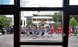 Pasukan Bregada melakukan Apel Siaga Yogya Damai di Halaman DPRD Yogyakarta, Ahad (11/10). Paguyuban Bregada Rakyat DIY menggelar Apel Siaga Yogya Damai. Hal ini menyusul adanya tindakan anarki saat unjuk rasa penolakan Omnibus Law pekan lalu. Pada apel ini paguyuban bergada DIY menolak keras aksi anarkis di Yogyakarta, dan mendukung pengusutan para pelaku anarkis. (FOTO : Wihdan Hidayat / Republika)