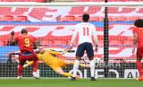 Pemain Inggris Marcus Rashford mencetak gol pertama timnya dari titik penalti pada pertandingan UEFA Nations League antara Inggris dan Belgia di London, Inggris, Ahad (11/10). (FOTO : GETTY POOL/Michael Regan / POOL)