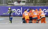 Rider Monster Energy Yamaha Valentino Rossi terjatuh di awal laga MotoGP Perancis di Sirkuit Le Mans, Ahad (11/10). (FOTO : REUTERS/Stephane Mahe)