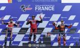 Danilo Petrucci (Ducati), Alex Marquez (Repsol Honda), dan Pol Espargaro (Red Bull KTM Factory Racing) merayakan kemanangan di podium laga MotoGP Perancis di Sirkuit Le Mans, Ahad (11/10). (FOTO : EPA-EFE/EDDY LEMAISTRE)