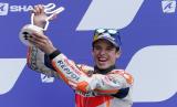 Pembalap MotoGP Spanyol Alex Marquez dari Repsol Honda merayakan tempat keduanya di laga MotoGP Perancis di Sirkuit Le Mans, Ahad (11/10). (FOTO : EPA-EFE/EDDY LEMAISTRE)