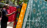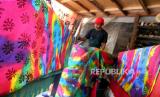 Nurohmat menjemur kain batik motif virus corona di Omah Kreatif Dongaji, Sewon, Bantul, Yogyakarta, Senin (12/10). Kain batik dengan motif ini dibuat oleh Nurohmat sebagai penanda zaman atau saat wabah Covid-19. Dengan menggunakan teknik cap pembuatan ini sejak Maret lalu. Kain ini dijual kepada pelanggan dengan harga mulai dari Rp 100 ribu hingga Rp 500 ribu tergantung motif dan kain yang digunakan. (FOTO : Wihdan Hidayat / Republika)
