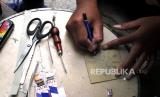 Pembuatan cap batik motif virus Corona dari kertas oleh Nurohmat di Omah Kreatif Dongaji, Sewon, Bantul, Yogyakarta, Senin (12/10). Kain batik dengan motif ini dibuat oleh Nurohmat sebagai penanda zaman atau saat wabah Covid-19. Dengan menggunakan teknik cap pembuatan ini sejak Maret lalu. Kain ini dijual kepada pelanggan dengan harga mulai dari Rp 100 ribu hingga Rp 500 ribu tergantung motif dan kain yang digunakan. (FOTO : Wihdan Hidayat / Republika)