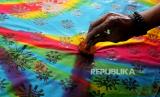 Nurohmat membatik kain motif virus corona dengan teknik cap di Omah Kreatif Dongaji, Sewon, Bantul, Yogyakarta, Senin (12/10). Kain batik dengan motif ini dibuat oleh Nurohmat sebagai penanda zaman atau saat wabah Covid-19. Dengan menggunakan teknik cap pembuatan ini sejak Maret lalu. Kain ini dijual kepada pelanggan dengan harga mulai dari Rp 100 ribu hingga Rp 500 ribu tergantung motif dan kain yang digunakan. (FOTO : Wihdan Hidayat / Republika)