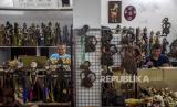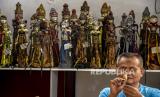 Perajin menyelesaikan pembuatan wayang golek di Galeri Wayang Cupumanik, Jalan H Akbar, Cicendo, Kota Bandung, Senin (12/10). Penjualan wayang golek dan souvenir wayang di galeri tersebut turun hingga 70 persen akibat kurangnya peminat dan tidak adanya regenerasi profesi dalang serta diperparah dengan pandemi Covid-19. Foto: Abdan Syakura/Republika (FOTO : ABDAN SYAKURA/REPUBLIKA)