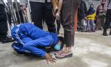 Seorang pelajar mencium kaki orang tuanya usai bebas dari penahanan karena terlibat aksi penolakan Undang-Undang Cipta Kerja di Polda Metro Jaya, Jakarta, Rabu (14/10). Polda Metro Jaya mengamankan 561 demonstran yang didominasi oleh remaja berstatus pelajar yang diduga terlibat kerusuhan saat aksi penolakan Undang-Undang Cipta kerja. Republika/Putra M. Akbar (FOTO : Republika/Putra M. Akbar)