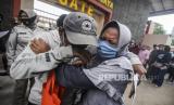Seorang pelajar berpelukan dengan orang tuanya usai bebas dari penahanan karena terlibat aksi penolakan Undang-Undang Cipta Kerja di Polda Metro Jaya, Jakarta, Rabu (14/10). Polda Metro Jaya mengamankan 561 demonstran yang didominasi oleh remaja berstatus pelajar yang diduga terlibat kerusuhan saat aksi penolakan Undang-Undang Cipta kerja. Republika/Putra M. Akbar (FOTO : Republika/Putra M. Akbar)