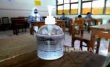Hand sanitizer diletakkan di depan kelas SMPN 1 Gantiwarno, Klaten, Jawa Tengah, Rabu (14/10). Dinas Pendidikan Klaten menunjuk lima sekolah menengah pertama untuk ujicoba pembelajaran tatap muka. Setiap kelas hanya berisi 10 siswa dan menggunakan protokol kesehatan Covid-19 ketat. Sesi tatap muka berlangsung selama satu jam. Pada pekan pertama diberikan materi tentang Covid-19, pekan kedua materi pembelajaran teknologi informasi. Dan memasuki mata pelajaran pada pekan ketiga. Pembelajaran dimulai pukul 07.00 hingga 08.00 untuk kelas 7, pukul 08.00 hingga 09.00 untuk kelas 8, dan 09.00 hingga 10.00 kelas 10. (FOTO : Wihdan Hidayat / Republika)