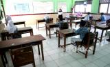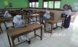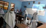 Murid kelas 8 mengikuti pembelajaran tatap muka di SMPN 1 Gantiwarno, Klaten, Jawa Tengah, Rabu (14/10). Pembelajaran dimulai pukul 07.00 hingga 08.00 untuk kelas 7, pukul 08.00 hingga 09.00 untuk kelas 8, dan 09.00 hingga 10.00 kelas 10. (FOTO : Wihdan Hidayat / Republika)