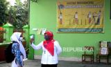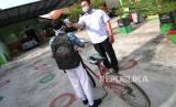 Guru mengecek suhu tubuh siswa di SMPN 1 Gantiwarno, Klaten, Jawa Tengah, Rabu (14/10). Dinas Pendidikan Klaten menunjuk lima sekolah menengah pertama untuk ujicoba pembelajaran tatap muka. Setiap kelas hanya berisi 10 siswa dan menggunakan protokol kesehatan Covid-19 ketat. (FOTO : Wihdan Hidayat / Republika)