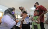 REPUBLIKA.CO.ID, TANGERANG -- Petugas medis Peskemas Gebang Raya memberikan imunisasi campak dan rubella kepada pelajar di SDIT Baidhaul Ahkam, Kota Tangerang, Banten, Kamis (15/10). Program imunisasi kepada pelajar di Kota Tangerang terus berjalan di tengah pandemi COVID-19 guna menjaga kesehatan anak dari serangan penyakit.