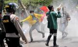 Mahasiswa Universitas Darul Ulum (Undar) lari masuk ke dalam kampus setelah polisi memadamkan ban yang dibakar massa saat aksi unjuk rasa menolak UU Cipta Kerja di jalan Gus Dur, Kabupaten Jombang, Jawa Timur, Kamis (15/10/2020). ANTARA FOTO/Syaiful Arif/NZ (FOTO : ANTARA FOTO)