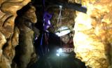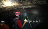 Tim eksplorasi sumber air menunjukkan salah satu cadangan air di dalam Gua Cikal, Jeruken, Panggang, Gunungkidul, Yogyakarta, Kamis (15/10). Tim ini mencari dan mengetes air di kawasan Gunungkidul. Kualitas, debit, dan cadangan air menjadi perhatian tim eksplorasi. Hal ini nanti menjadi penentu apakah layak untuk dipasang pompa permanen. Dengan diketemukan sumber air atau cadangan air ini bisa menjadi solusi kelangkaan air saat kemarau. (FOTO : Wihdan Hidayat / Republika)