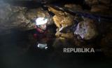 Tim eksplorasi sumber air menyusuri aliran air di dalam Gua Cikal, Jeruken, Panggang, Gunungkidul, Yogyakarta, Kamis (15/10). Tim ini mencari dan mengetes air di kawasan Gunungkidul. Kualitas, debit, dan cadangan air menjadi perhatian tim eksplorasi. Hal ini nanti menjadi penentu apakah layak untuk dipasang pompa permanen. Dengan diketemukan sumber air atau cadangan air ini bisa menjadi solusi kelangkaan air saat kemarau. (FOTO : Wihdan Hidayat / Republika)
