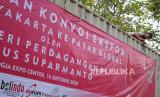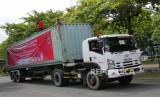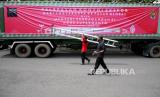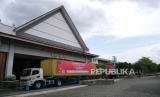 REPUBLIKA.CO.ID, YOGYAKARTA -- Karyawan memasang spanduk di atas truk kontainer berisi komoditas ekspor menunggu pelepasan di Jogja Expo Center, Yogyakarta, Jumat (16/10).