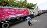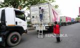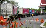 Deretan truk kontainer berisi komoditas ekspor menunggu pelepasan di Jogja Expo Center, Yogyakarta, Jumat (16/10). Sebanyak tujuh kontainer berisi kerajinan dan komoditas ekspor menunggu pemberangkatan menuju pelabuhan Tanjung Emas Semarang. Salah satu tujuan ekspor ini adalah kawasan Eropa. Pelepasan ekspor ini menjadi angin segar industri kerajinan di Yogyakarta di masa pandemi Covid-19. (FOTO : Wihdan Hidayat / Republika)