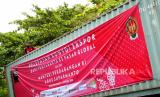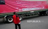 Karyawan memasang spanduk di atas truk kontainer berisi komoditas ekspor menunggu pelepasan di Jogja Expo Center, Yogyakarta, Jumat (16/10). Sebanyak tujuh kontainer berisi kerajinan dan komoditas ekspor menunggu pemberangkatan menuju pelabuhan Tanjung Emas Semarang. Salah satu tujuan ekspor ini adalah kawasan Eropa. Pelepasan ekspor ini menjadi angin segar industri kerajinan di Yogyakarta di masa pandemi Covid-19. (FOTO : Wihdan Hidayat / Republika)