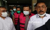 Mantan Kadiv Hubungan Internasional Polri Irjen Pol Napoleon Bonaparte (kedua kanan) dan mantan Karo Korwas PPNS Bareskrim Polri Brigjen Pol Prasetijo Utomo (ketiga kanan) mengenakan baju tahanan saat pelimpahan tahap II kasus dugaan pencabutan red notice atas nama Joko Soegiarto Tjandra alias Djoko Tjandra di Kantor Kejaksaan Negeri Jakarta Selatan, Jakarta, Jumat (16/10/2020). Penyidik Bareskrim Polri melimpahkan tersangka dan barang bukti untuk tersangka Irjen Pol Napoleon Bonaparte, Brigjen Pol Prasetijo Utomo dan pengusaha Tommy Sumardi ke Kejaksaan Negeri Jakarta Selatan untuk segera disidangkan. (FOTO : ANTARA/Rommy S)