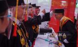 Ketua Sekolah Tinggi Ilmu Hukum (STIH) Sultan Adam Banjarmasin Abdul Halim (tengah) memindahkan tali di topi toga wisudawan saat prosesi wisuda dengan protokol kesehatan di Gedung STIH Sultan Adam, Banjarmasin, Kalimantan Selatan, Ahad (18/10/2020). Wisuda yang digelar secara tatap muka tersebut diikuti sebanyak 153 wisudawan dengan menerapkan protokol kesehatan yang ketat guna mencegah penyebaran COVID-19 di lingkungan universitas. (FOTO : Makna Zaezar/ANTARA )