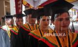 REPUBLIKA.CO.ID, BANJARMASIN -- Sejumlah wisudawan mengikuti prosesi wisuda dengan protokol kesehatan di Gedung Sekolah Tinggi Ilmu Hukum (STIH) Sultan Adam, Banjarmasin, Kalimantan Selatan, Ahad (18/10/2020).