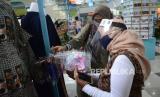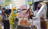 Istri Wali Kota Bandung Siti Muntamah mengamati bermacam masker saat berkunjung ke Pasar Kreatif Bandung yang diinisiasi Dinas Perdagangan dan Perindustrian dan Dekranasda Kota Bandung, di Cihampelas Walk (Ciwalk), Kota Bandung, Ahad (18/10). Acara tersebut menghadirkan bermacam produk kreatif karya pengusaha lokal, digelar sebagai salah satu upaya membangkitkan sektor ekonomi khususnya di masa pandemi. Pasar Kreatif Bandung berlangsung hingga 25 Oktober 2020. (FOTO : Edi Yusuf/Republika)