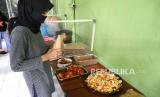 Relawan memindahkab sayur untuk nasi gratis untuk buruh gendong di Muja-Muju, Yogyakarta, Senin (19/10). Sebanyak 130 bungkus nasi siap makan disiapkan untuk buruh gendong di Pasar Beringharjo yang terdampak Covid-19. Setiap hari puluhan relawan membantu memasak, membungkus, DNA mengirimkan nasi. Namun jika ada donatur yang mengirimkan nasi akan diberikan ke tukang becak kayuh. (FOTO : Wihdan Hidayat / Republika)