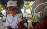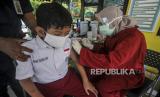 REPUBLIKA.CO.ID, JAKARTA -- Sejumlah pelajar saat melaksanakan imunisasi di kawasan Tebet, Jakarta, Senin (19/10).