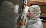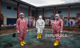 Dua perawat dan seorang petugas keamanan memakai pakaian hazmat dan alat pelindung diri lengkap untuk merawat warga binaan terkonfirmasi positif COVID-19 di Lapas Perempuan Pekanbaru. (FOTO : ANTARA FOTO/FB Anggoro)