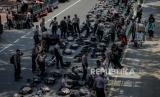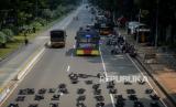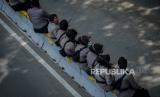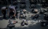 Aparat kepolisian melakukan persiapan untuk pengamanan aksi demonstari di jalan Medan Merdeka Barat, Jakarta, Selasa (20/10). Sebanyak 1.200 personel gabungan dari aparat kepolisian dan anggota TNI dikerahkan untuk mengamankan demonstrasi yang digelar BEM SI terkait penolakan terhadap UU Omnibus Law Cipta Kerja sekaligus peringatan satu tahun pemerintahan Joko Widodo dan Maruf Amin di kawasan Istana Negara. Republika/Thoudy Badai (FOTO : Republika/Thoudy Badai)