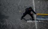 Aparat kepolisian memasang kawat berduri di jalan Medan Merdeka Barat, Jakarta, Selasa (20/10). Sebanyak 1.200 personel gabungan dari aparat kepolisian dan anggota TNI dikerahkan untuk mengamankan demonstrasi yang digelar BEM SI terkait penolakan terhadap UU Omnibus Law Cipta Kerja sekaligus peringatan satu tahun pemerintahan Joko Widodo dan Maruf Amin di kawasan Istana Negara. Republika/Thoudy Badai (FOTO : Republika/Thoudy Badai)