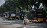 Kendaraan barikade terparkir di jalan Medan Merdeka Barat yang disiapkan untuk pengamanan aksi demonstrasi di Jakarta, Selasa (20/10). Sebanyak 1.200 personel gabungan dari aparat kepolisian dan anggota TNI dikerahkan untuk mengamankan demonstrasi yang digelar BEM SI terkait penolakan terhadap UU Omnibus Law Cipta Kerja sekaligus peringatan satu tahun pemerintahan Joko Widodo dan Maruf Amin di kawasan Istana Negara. Republika/Thoudy Badai (FOTO : Republika/Thoudy Badai)