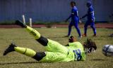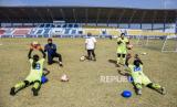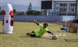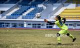 Penjaga gawang tim sepak bola putri Jawa Barat menjalani sesi latihan di Stadion Sport Jabar Arcamanik, Bandung, Jawa Barat, Selasa (20/10/2020). Latihan tersebut digelar untuk menjaga stamina para pemain dalam rangka persiapan PON XX di Papua 2021 mendatang. (FOTO : ANTARA/Raisan Al Farisi)
