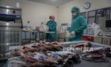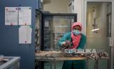 Petugas medis Palang Merah Indonesia (PMI) Solo memindahkan darah dan plasma darah ke dalam ruang penyimpanan di kantor Unit Transfusi Darah PMI Solo, Jawa Tengah, Selasa (20/10/2020). PMI Kota Solo akan menyediakan plasma konvalesen untuk terapi penyembuhan pasien COVID-19 sekaligus mengajak para penyintas yang sembuh dari COVID-19 mendonorkan plasma darah konvalesen untuk membantu pasien COVID-19 yang masih dalam perawatan. (FOTO : ANTARA/Mohammad Ayudha)