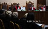 Majelis hakim memimpin sidang kasus suap dan gratifikasi pengurusan fatwa Mahkamah Agung (MA) Djoko Tjandra dengan terdakwa Pinangki Sirna Malasari di Pengadilan Tipikor, Jakarta, Rabu (21/10/2020). Sidang tersebut mengagendakan pembacaan tanggapan Jaksa Penuntut Umum (JPU) atas eksepsi atau nota keberatan terdakwa. (FOTO : ANTARA/Puspa Perwitasari)