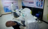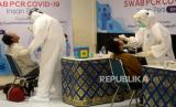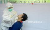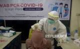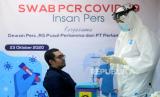 REPUBLIKA.CO.ID, JAKARTA-- Petugas medis melakukan tes usap PCR kepada insan media di Hall Gedung Dewan Pers, Jakarta, Jumat (23/10).