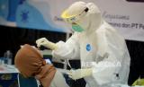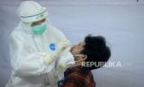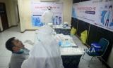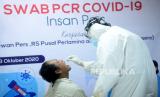 Petugas medis melakukan tes usap PCR kepada insan media di Hall Gedung Dewan Pers, Jakarta, Jumat (23/10). Dewan Pers bekerja sama dengan Pertamina memberikan pelayanan test usap PCR gratis kepada 105 insan media hal ini sebagai wujud melindungi para insan media yang selama ini harus tetap bekerja di lapangan untuk menyampaikan informasi yang dibutuhkan publik.Prayogi/Republika. (FOTO : Prayogi/Republika)